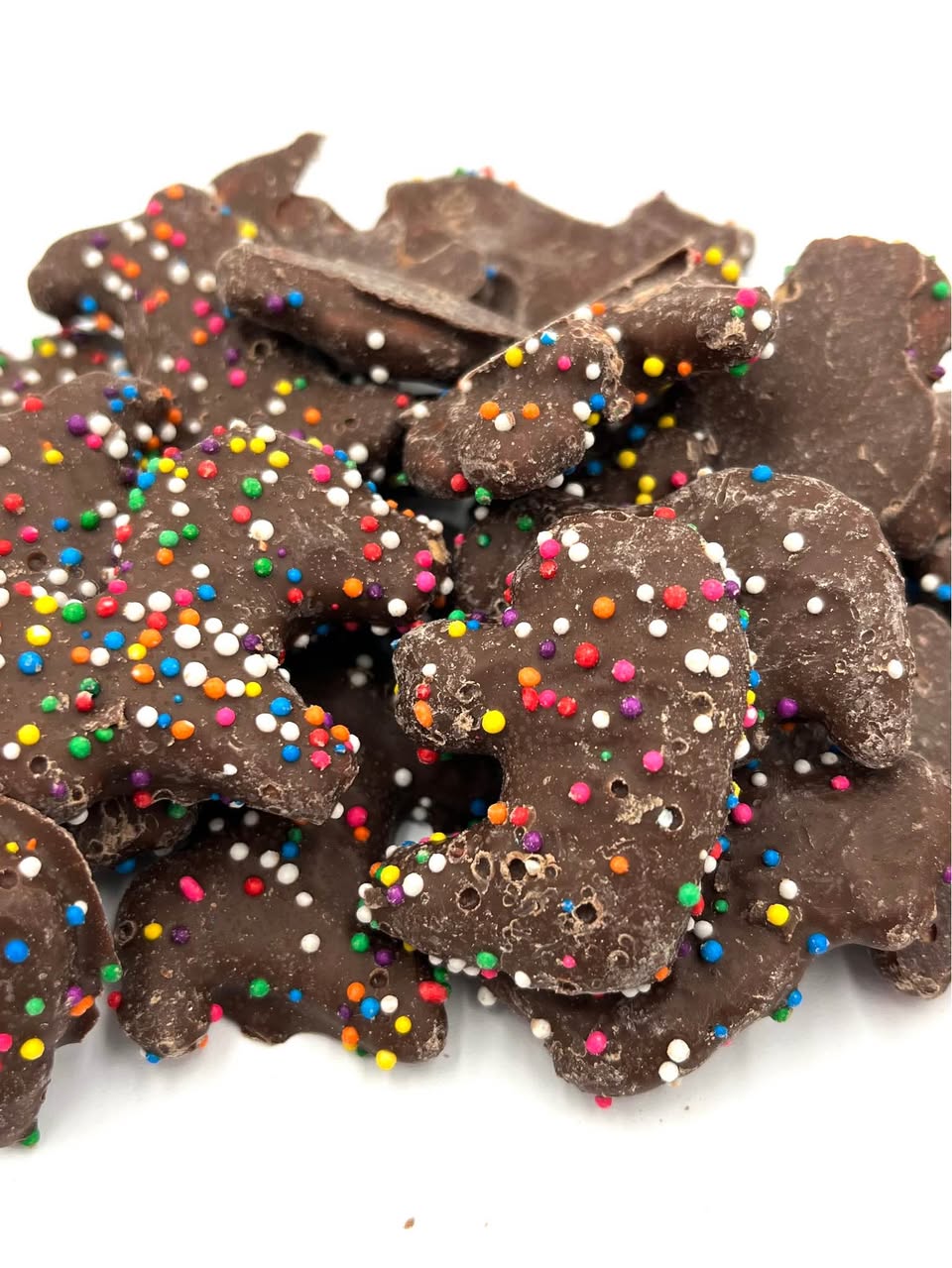 Chocolate Celebration Animal Crackers are coated with a thick layer of creamy milk chocolate and topped with colorful candy beads. Your kids, or the kid in you, will love them!