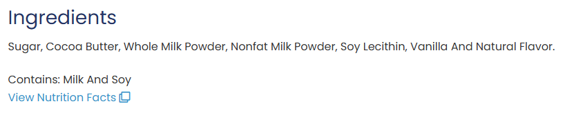 ING: Sugar, Cocoa Butter, Whole Milk Powder, Nonfat Milk Powder, Soy Lecithin, Vanilla And Natural Flavor.